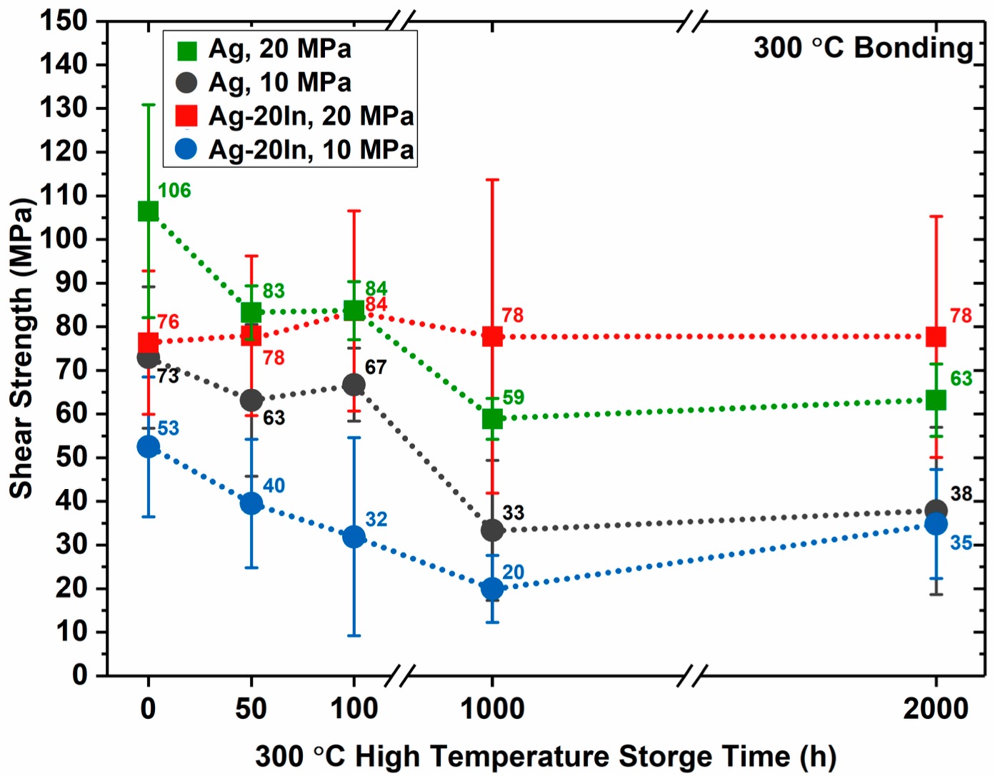 所有測試均在300℃的高溫下進行,上圖為在高溫存儲時間50h、100h、1000h與2000h四個階段的材料剪切力變化趨勢。