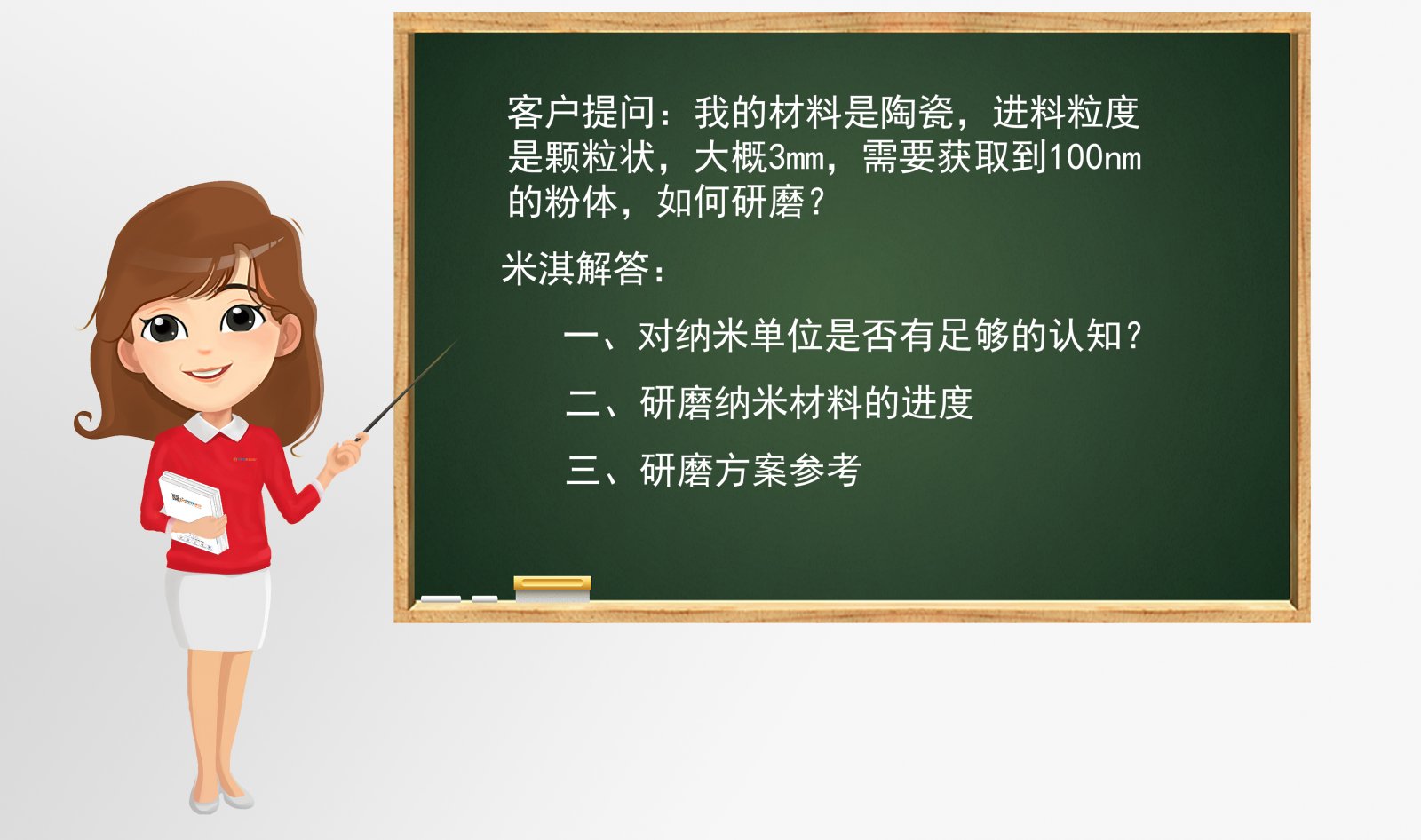 客戶提問(wèn):我的材料是陶瓷,進(jìn)料粒度是顆粒狀,大概3mm,需要獲取到100nm的粉體,如何研磨?