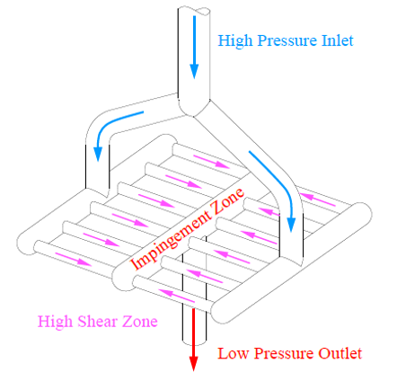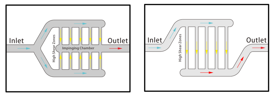 “Y”型均質(zhì)腔,物料流體在加速過程中被分為兩股細(xì)流,通過微管通道后正面碰撞混合,在獲得較高的結(jié)合相對速度時其本身所受的碰撞力較為柔和,有利于混合、乳化作用。