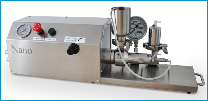 微射流均質(zhì)機利用幾十到幾百微米左右噴嘴形成超音速射流,進(jìn)行相互對撞和極強烈的剪切,在較高的均質(zhì)壓力, 產(chǎn)生較好的粒徑分布效果。優(yōu)點是高壓條件下可以連續(xù)化作業(yè)。