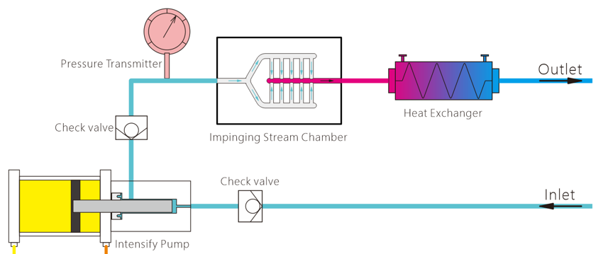 物料流經(jīng)單向閥后,在高壓腔泵里加壓,通過(guò)微米級(jí)的噴嘴,以亞音速撞擊在乳化腔上,同時(shí)通過(guò)強(qiáng)烈的空穴,剪切效應(yīng),得到足夠小而均一的粒徑分布。