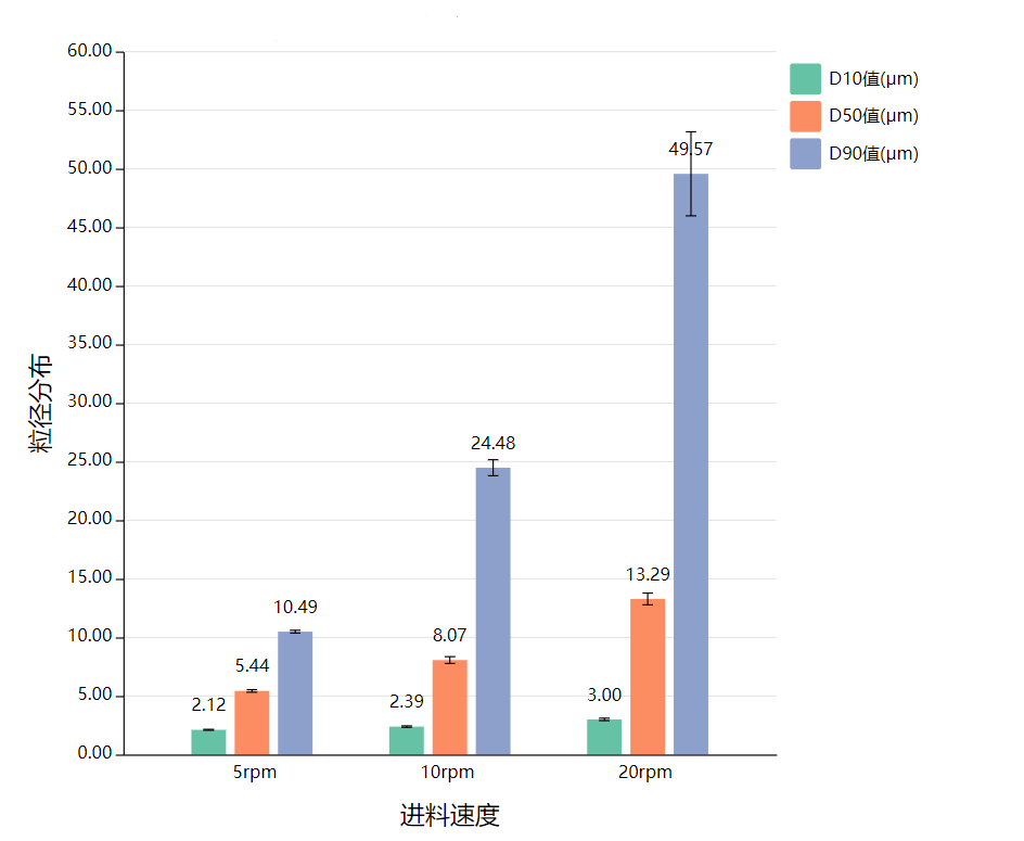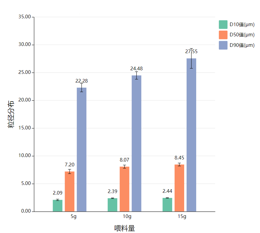 諾澤流體科技(上海)有限公司的氣流粉碎機采用的是水平式的雙螺桿進料器,通過馬達轉(zhuǎn)動帶動螺桿的運動,從而推送物料進入粉碎腔內(nèi)。在恒定的轉(zhuǎn)速條件、粉碎壓力條件下,通過對不同重量物料進行粉碎處理,可以看到粒徑分布的規(guī)律:隨著喂料量的增大,粒徑分布有增長的趨勢。