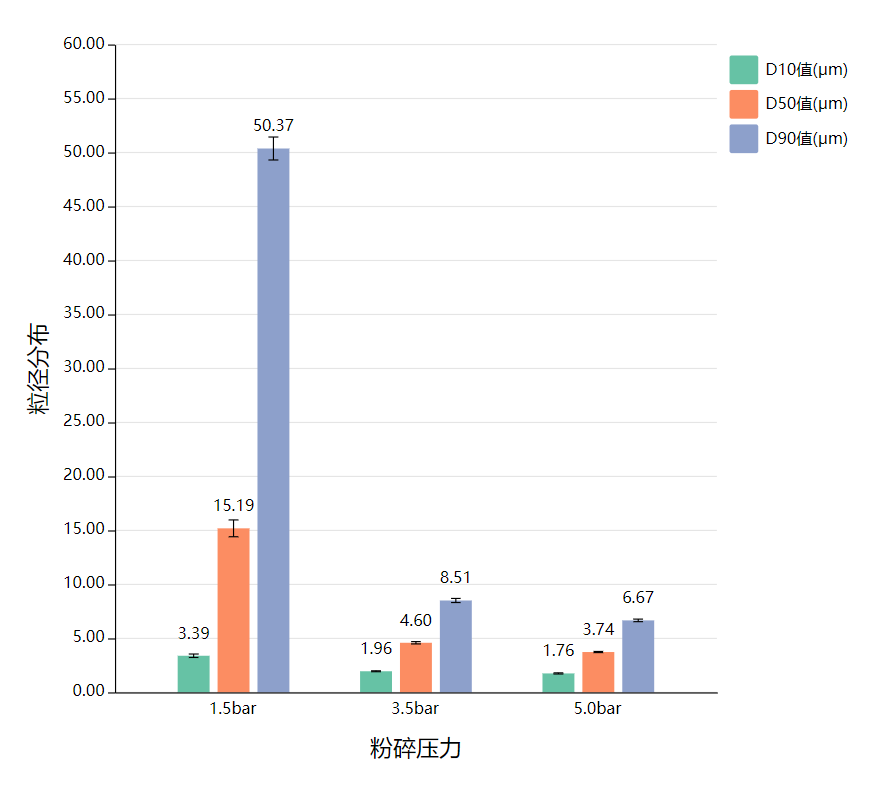 粉碎壓力大小是影響噴射氣流速度的重要因素,壓力越大,噴射氣流速度越高。被加速的顆粒在粉碎腔內(nèi)碰撞速度越高,因此粉碎程度越徹底,產(chǎn)品粒度分布越窄。