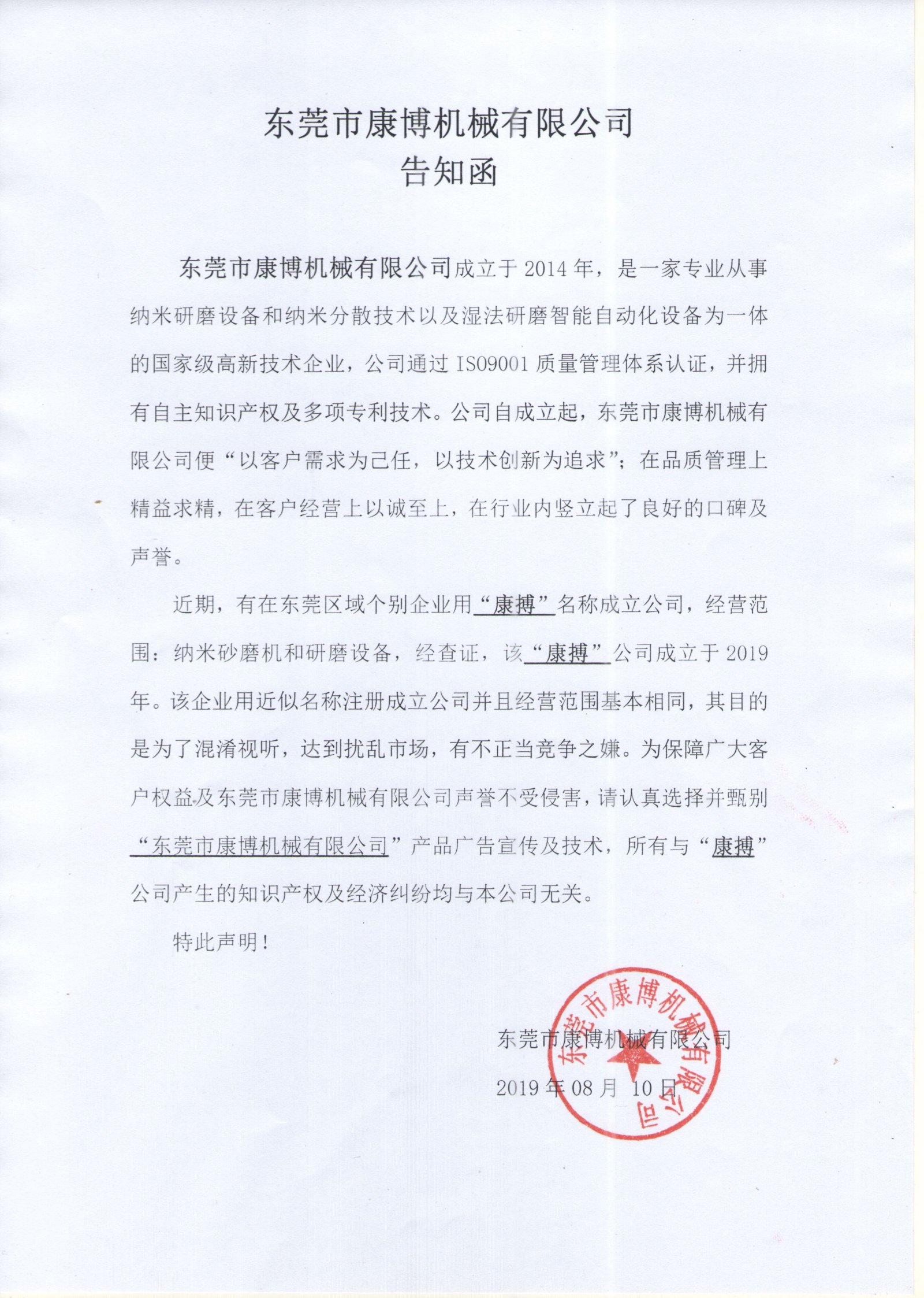 近期,有在東莞區(qū)域個(gè)別企業(yè)用“康搏”名稱成立公司,經(jīng)營(yíng)范圍:納米砂磨機(jī)和研磨設(shè)備,經(jīng)查證,該“康搏”公司成立于2019年。該企業(yè)用近似名稱注冊(cè)成立公司并且經(jīng)營(yíng)范圍基本相同,其目的是為了混淆視聽(tīng),達(dá)到擾亂市場(chǎng),有不正當(dāng)競(jìng)爭(zhēng)之嫌。為保障廣大客戶權(quán)益及東莞市康博機(jī)械有限公司聲譽(yù)不受侵害,請(qǐng)認(rèn)真選擇并甄別“東莞市康博機(jī)械有限公司”產(chǎn)品廣告宣傳及技術(shù),所有與“康搏”公司產(chǎn)生的知識(shí)產(chǎn)權(quán)及經(jīng)濟(jì)糾紛均與本公司無(wú)關(guān)。