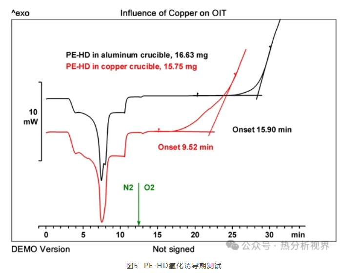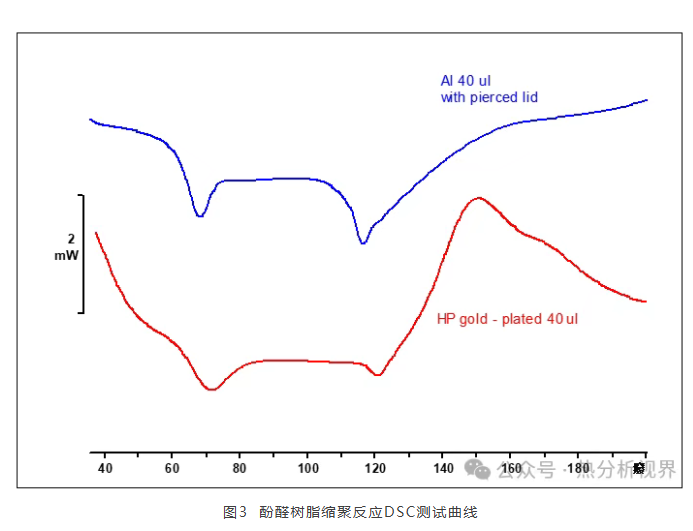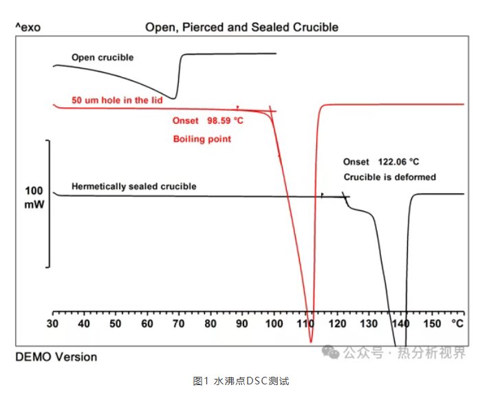 01 鋁坩堝 純鋁的熔點(diǎn)是660℃,實(shí)際使用的40ul鋁坩堝熔點(diǎn)都低于660℃,有國產(chǎn)坩堝和進(jìn)口坩堝之分,材質(zhì)來源不同。進(jìn)口坩堝質(zhì)量均一,純度高,可避免樣品與坩堝雜質(zhì)產(chǎn)生副反應(yīng),適用于常規(guī)DSC和低于640℃的TGA/DSC測(cè)試。對(duì)于比熱和重復(fù)性測(cè)試來說,進(jìn)口坩堝的效果更好。梅特勒-托利多鋁坩堝高度低并且底部十分平坦(確保盡可能小的溫度梯度),可用于固體和液體樣品的測(cè)試??梢圆捎貌辉咨w子、50um孔蓋子和大孔蓋子三種形式密封達(dá)到不同的測(cè)試效果:完全密封耐壓可達(dá)到0.2Mpa,可以用于抑制揮發(fā)性物質(zhì)的吸熱蒸發(fā)、汽化或升華(比如比熱容和蛋白變形測(cè)試);50ul孔蓋子采用激光打孔,能形成自生成氣氛測(cè)試低沸點(diǎn)液體的沸點(diǎn),同時(shí)還可以分離重疊的熱效應(yīng);大孔蓋子或者無蓋可保持坩堝內(nèi)的氣氛和爐體氣氛一致(比如氧化誘導(dǎo)期測(cè)試)。下圖1是不同密封形式坩堝水汽化的測(cè)試,開口坩堝低溫也有揮發(fā)吸熱峰較寬,密閉坩堝在超過坩堝耐壓極限爆開,爆開溫度取決于樣品量,50um孔的蓋子能形成自生成氣氛才能準(zhǔn)確地測(cè)得水的沸點(diǎn)是98.59℃。40ul鋁坩堝還有帶定位針和不帶定位針兩種,不帶定位針的適用于帶自動(dòng)進(jìn)樣器的儀器,帶定位針的只能手動(dòng)加樣,可保證每次放置同樣的位置,結(jié)果重復(fù)性較好。 圖1 水沸點(diǎn)DSC測(cè)試 有時(shí)我們?yōu)榱说玫礁玫姆直媛驶蛘邽榱吮苊獗∧悠窚y(cè)試過程中發(fā)生卷曲導(dǎo)致測(cè)試曲線異常(見圖2),我們還可能用到20ul的輕質(zhì)鋁坩堝,坩堝與蓋之間的狹小空間可以形成自生成氣氛,在蓋上提前打孔也可以使得坩堝內(nèi)外氣氛聯(lián)通。 圖2 PE薄膜DSC測(cè)試 如果用40ul的鋁坩堝測(cè)試熱效應(yīng)微弱,我們還可以采用大體積的鋁坩堝(100ul和160ul)。不帶定位針的還有一種25ul的鋁坩堝,直徑4mm,是焓值重復(fù)性測(cè)試的最佳選擇。 02 高/中壓坩堝 對(duì)于DSC來說不建議做到分解溫度,因?yàn)榉纸猱a(chǎn)物一方面有可能會(huì)污染爐體和傳感器,另一方面坩堝密閉內(nèi)部壓力過大有可能爆開坩堝蓋子,導(dǎo)致測(cè)試結(jié)果不準(zhǔn)確。對(duì)于某些特殊應(yīng)用比如反應(yīng)安全必須做到分解溫度,我們可以選擇高壓坩堝。高壓坩堝有重復(fù)使用(不銹鋼30ul)和一次性(不銹鋼鍍金,25ul和40ul)的,如果追求測(cè)試結(jié)果準(zhǔn)確性和重復(fù)性,建議使用一次性高壓坩堝,相對(duì)成本較高,可避免重復(fù)使用高壓坩堝多次使用后有可能的清洗殘留和密封性減弱問題。對(duì)于阻止汽化且壓力超過0.2Mpa的測(cè)試我們采用中壓(耐壓2Mpa)或者高壓坩堝(耐壓15Mpa)。下圖3是酚醛樹脂縮聚反應(yīng)測(cè)試,由于DSC測(cè)試的是綜合熱效應(yīng),縮聚反應(yīng)放熱而水汽化吸熱,采用40ul鋁坩堝蓋子扎孔測(cè)試根本測(cè)不到縮聚反應(yīng)放熱峰,而采用高壓坩堝測(cè)試縮聚反應(yīng)放熱峰就很明顯。 圖3 酚醛樹脂縮聚反應(yīng)DSC測(cè)試曲線 高/中壓坩 03 氧化鋁坩堝 氧化鋁坩堝就是我們通常說的陶瓷坩堝,一般用于TGA測(cè)試,尤其是測(cè)試熱重信號(hào)而不是熱流信號(hào)。可重復(fù)使用,物理清潔后(如果需要,在清水中(或10%的鹽酸溶液中)清洗,因?yàn)楹芏帑}類能在水中溶解。),儲(chǔ)存起來備用。對(duì)于有些小分子物質(zhì)的測(cè)試,小分子有可能滲透陶瓷坩堝,導(dǎo)致測(cè)試結(jié)果差,而采用鉑金坩堝的測(cè)試結(jié)果準(zhǔn)確且重復(fù)性好(見圖4潤(rùn)滑油Noack 揮發(fā)性測(cè)試)。對(duì)于大多數(shù)同步測(cè)試,常用陶瓷坩堝,但是如果想得到更好的熱流信號(hào),建議采用鉑金坩堝或者鋁坩堝(低于640℃的實(shí)驗(yàn)),也可以采用70ul的鉑金坩堝內(nèi)嵌50ul陶瓷坩堝的方式獲得更好的熱流信號(hào),以保護(hù)鉑金坩堝。如果實(shí)驗(yàn)溫度高于1000℃,同質(zhì)的材料可能會(huì)發(fā)生燒結(jié),建議在坩堝和支架之間墊一個(gè)藍(lán)寶石墊片。為了避免有些樣品在稱量后和測(cè)試前發(fā)生變化(比如氧化或者吸潮等),可以采用黃蜂針扎孔(鋁坩堝)或者特殊鋁蓋(陶瓷坩堝)。 圖4 潤(rùn)滑油Noack 揮發(fā)性測(cè)試 04 鉑金坩堝 鉑金坩堝屬于貴金屬,價(jià)格較貴,主要用于溫度超過640?C的TGA或DSC測(cè)試。測(cè)試得到的SDTA和DSC曲線通常比使用氧化鋁坩堝得到的曲線好。但要注意熔融態(tài)金屬很容易與鉑生成合金,這可能會(huì)在坩堝底部生成一個(gè)洞。煤煙(即炭黑)是在無氧氣氛中產(chǎn)生的一種鉑中毒。 05 其它坩堝 銅坩堝不帶蓋,專門用于銅環(huán)境中的氧化穩(wěn)定性測(cè)試(OIT),銅起催化作用,比如測(cè)試電纜材料的氧化誘導(dǎo)期。通常將使用這種坩堝測(cè)試得到的氧化誘導(dǎo)時(shí)間與使用惰性鋁坩堝測(cè)試得到的結(jié)果進(jìn)行比較(見圖5)。金坩堝耐化學(xué)腐蝕,除鋁坩堝外唯一能夠冷壓密封的坩堝(耐壓0.3Mpa),若不是價(jià)格昂貴將會(huì)得到更多的使用。藍(lán)寶石坩堝(PCA)是一種多晶氧化鋁,材料結(jié)構(gòu)緊實(shí)、耐化學(xué)腐蝕、惰性。PCA坩堝能夠適用于所有的材料,包括熔融金屬鐵或鎳。 圖5 PE-HD氧化誘導(dǎo)期測(cè)