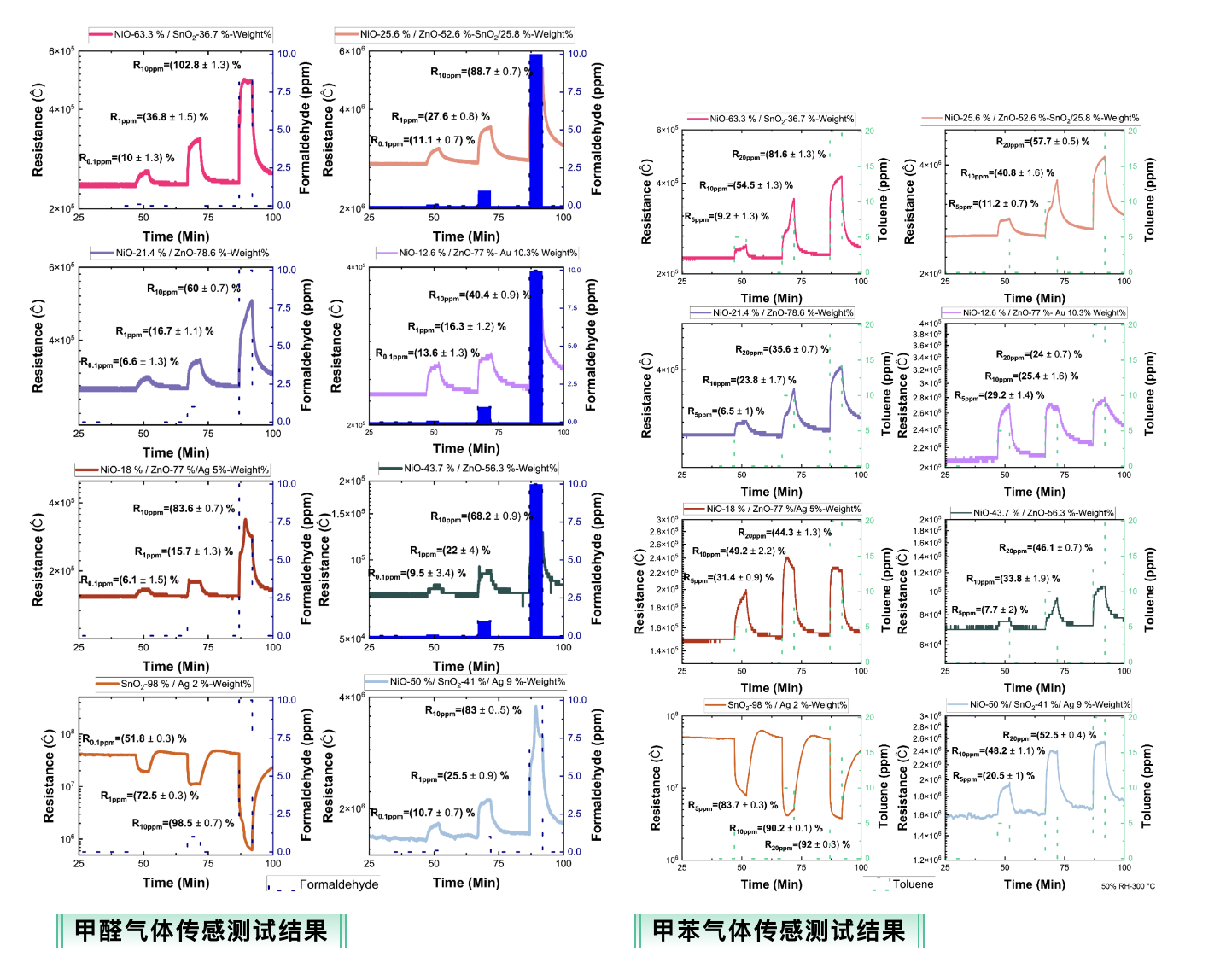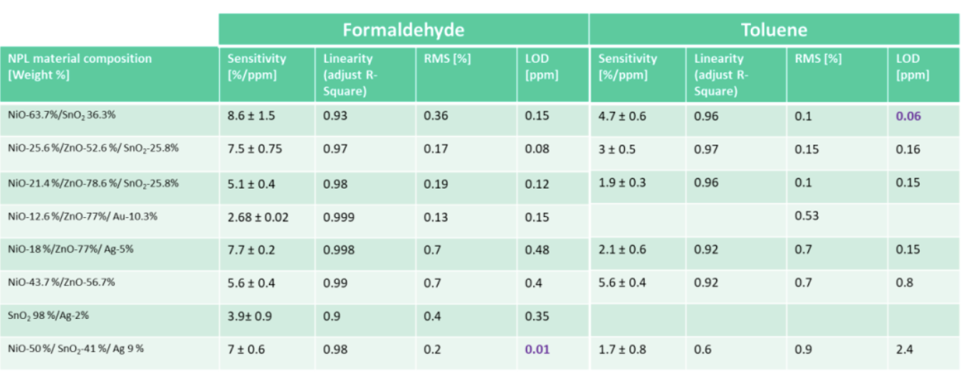 在本案例中,基于金屬氧化物半導(dǎo)體(MOS)及金屬催化劑的納米多孔層(NPLs)通過(guò)印刷方式沉積在多傳感器陣列平臺(tái)上,并以甲苯和甲醛作為目標(biāo)氣體進(jìn)行測(cè)試。最多三種不同組分的 NPLs 被用作傳感層。研究從靈敏度、選擇性、響應(yīng)/恢復(fù)時(shí)間及檢出限(LOD)等關(guān)鍵性能指標(biāo)出發(fā),系統(tǒng)分析了材料組成對(duì)氣體傳感性能的影響。