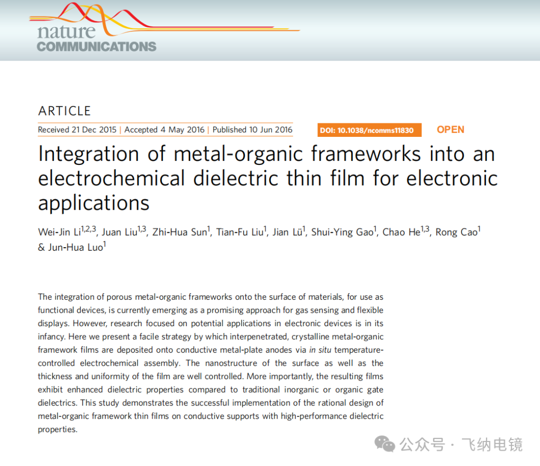 Integration of metal-organic frameworks into an electrochemical dielectric thin film for electronic applications(將金屬-有機(jī)框架材料集成到電化學(xué)介電薄膜中用于電子材料領(lǐng)域)