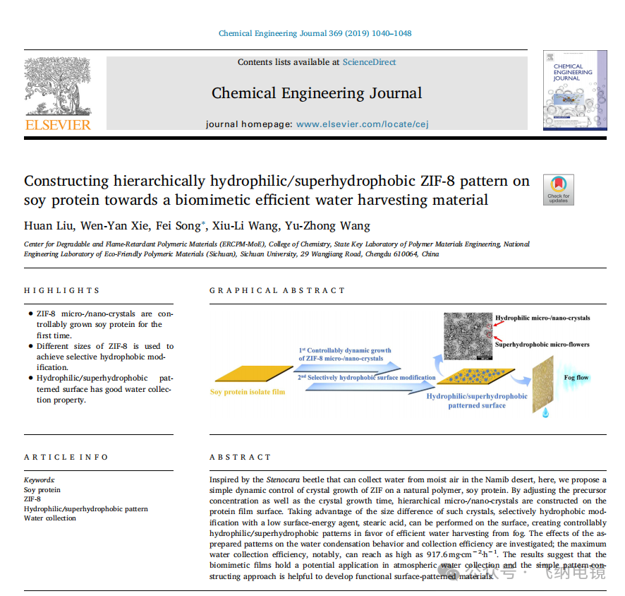 Constructing hierarchically hydrophilic/superhydrophobic ZIF-8 pattern on soy protein towards a biomimetic efficient water harvesting material(在大豆蛋白上構(gòu)建層次化的親水/超疏水ZIF-8圖案,以制備仿生高效集水材料)