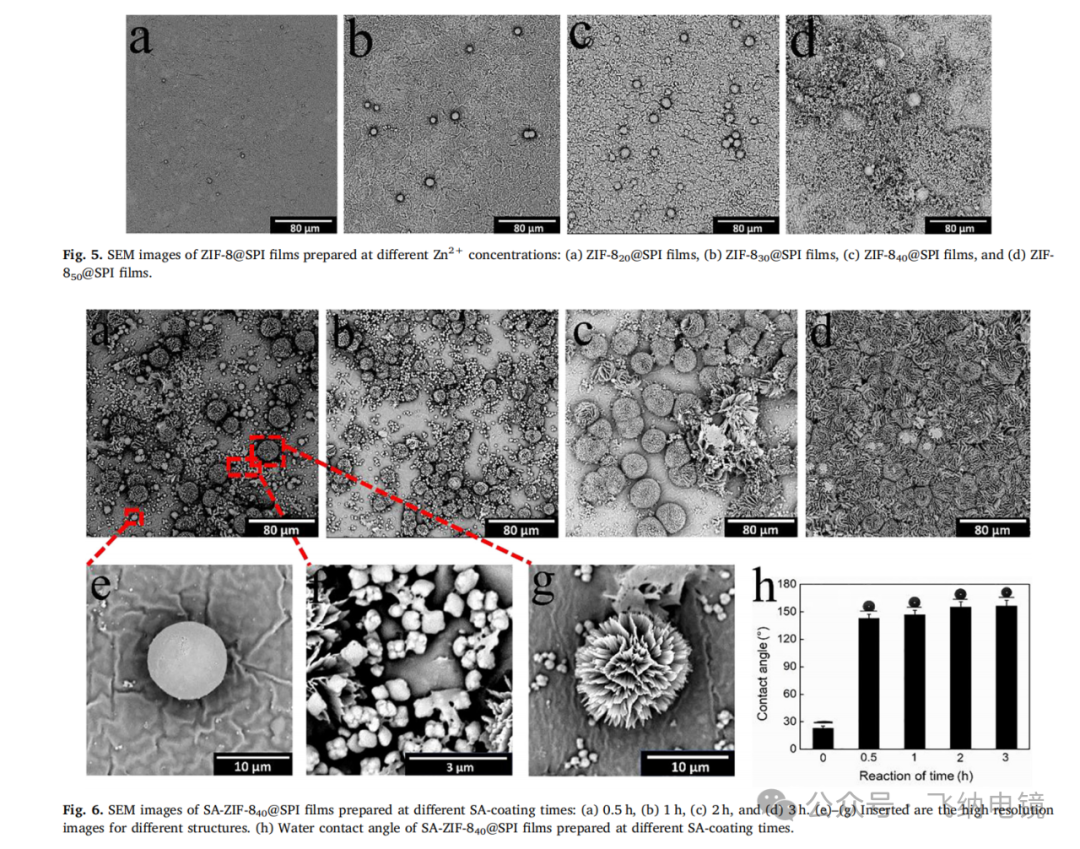 文章受到納米比亞沙漠中的 Stenocara 甲蟲的啟發(fā),這種甲蟲能夠從濕潤的空氣中收集水分以維持生命。甲蟲背部的結(jié)構(gòu)由親水性突起分布在超疏水背景上,這種結(jié)構(gòu)使得水分子能夠在親水區(qū)域凝聚成滴,并在重力作用下滾落?;谶@一自然現(xiàn)象,研究人員設(shè)計(jì)了一種類似的親水/超疏水圖案化表面,用于從霧氣中收集水分。研究人員使用了飛納掃描電子顯微鏡(Phenom ProX)來觀察 ZIF-8 晶體在大豆蛋白(SPI)薄膜表面的生長過程和形貌變化。在低倍率下可以觀察到較大的微米級(jí)晶體,這些晶體在薄膜表面均勻分布。在高倍率下可以觀察到較小的納米級(jí)晶體,這些晶體分布在微米級(jí)晶體表面和薄膜表面,形成了層次化的結(jié)構(gòu)。