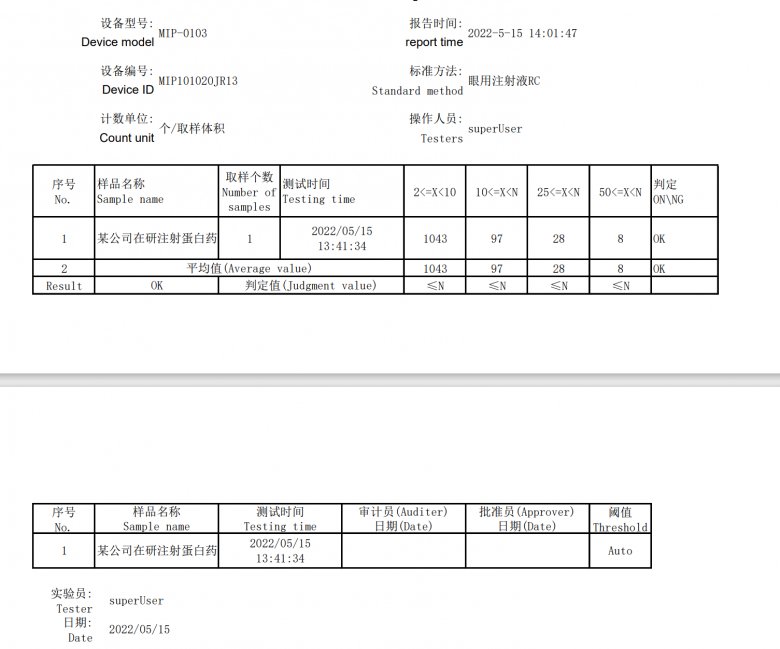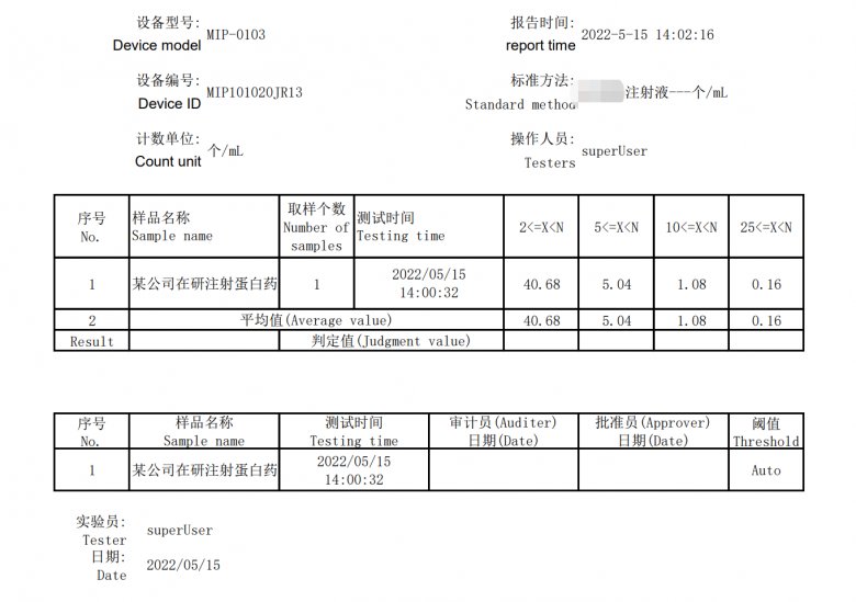 我選取了兩組用顯微計數(shù)法不溶性微粒儀(YH-MIP-0103)測試某企業(yè)生產(chǎn)的兩批注射蛋白藥中不溶性微粒按粒徑的數(shù)量分布報告如下:
