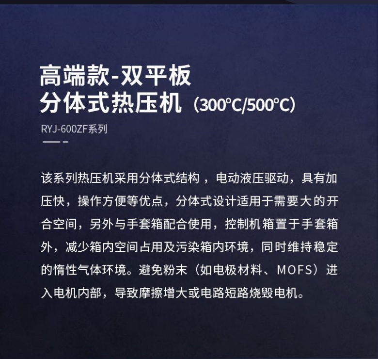 該系列熱壓機采用分體式結構 ,電動液壓驅(qū)動,具有加壓快,操作方便等優(yōu)點,分體式設計適用于需要大的開合空間,另外與手套箱配合使用,控制機箱置于手套箱外,減少箱內(nèi)空間占用及污染箱內(nèi)環(huán)境,同時維持穩(wěn)定的惰性氣體環(huán)境。避免粉末(如電極材料、MOFs)進入電機內(nèi)部,導致摩擦增大或電路短路燒毀電機。