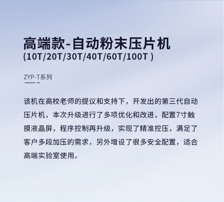該機在高校老師的提議和支持下,開發(fā)出的第三代自動壓片機,本次升級進行了多項優(yōu)化和改進,配置7寸觸摸液晶屏,程序控制再升級,實現(xiàn)了精準控壓,滿足了客戶多段加壓的需求,另外增設了很多安全配置,適合高端實驗室使用。