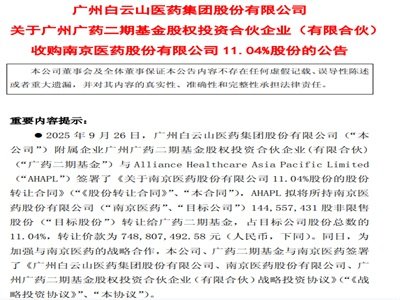 - ·出資7.5億!廣藥白云山“空降”南京醫(yī)藥二股東